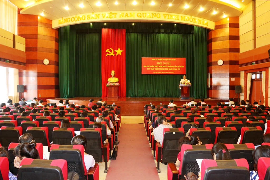 Thực hiện Kế hoạch số 47-KH/ĐUK ngày 03 tháng 7 năm 2017 về học tập, quán triệt Nghị quyết Hội nghị lần thứ 5 Ban chấp hành Trung ương Đảng (khóa XII), sáng ngày 28/8/2017, Đảng uỷ Trường Đại học Luật Hà Nội đã tổ chức Hội nghị học tập, quán triệt, triển khai thực hiện Nghị quyết Hội nghị lần thứ năm 5 Ban chấp hành Trung ương Đảng (khóa XII). Hội nghị được tổ chức tại Hội trường A.403 Trường Đại học Luật Hà Nội với sự tham gia của toàn thể đảng viên trong Đảng bộ và lãnh đạo chủ chốt các đoàn thể Trường Đại học Luật Hà Nội.